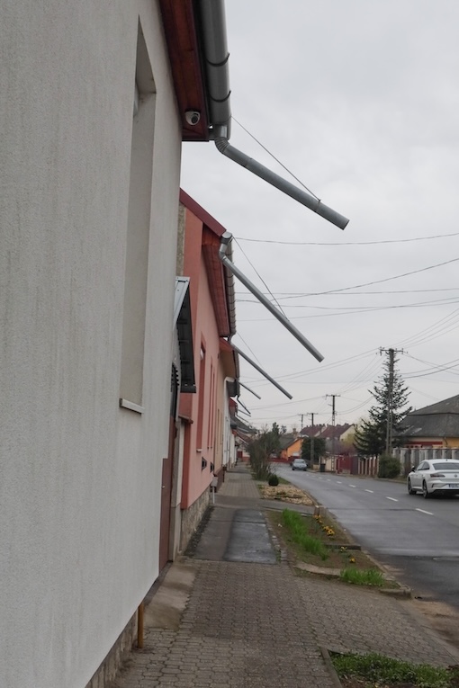 壁にそって縦樋を落としてから開放するよりは歩道が水浸しにならない良心的なアイデアなのかも。