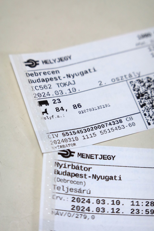 下がニールバートールからの乗車券で上がデブレツェン駅からブダペスト西駅へインターシティ(IC)特急指定席券です。