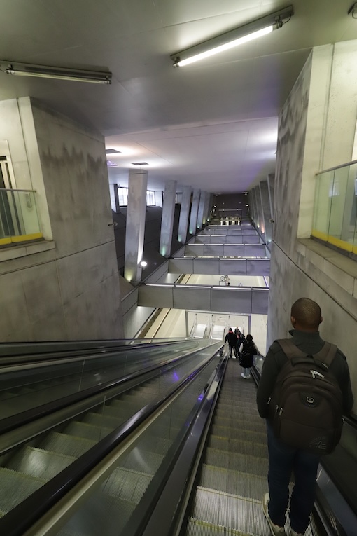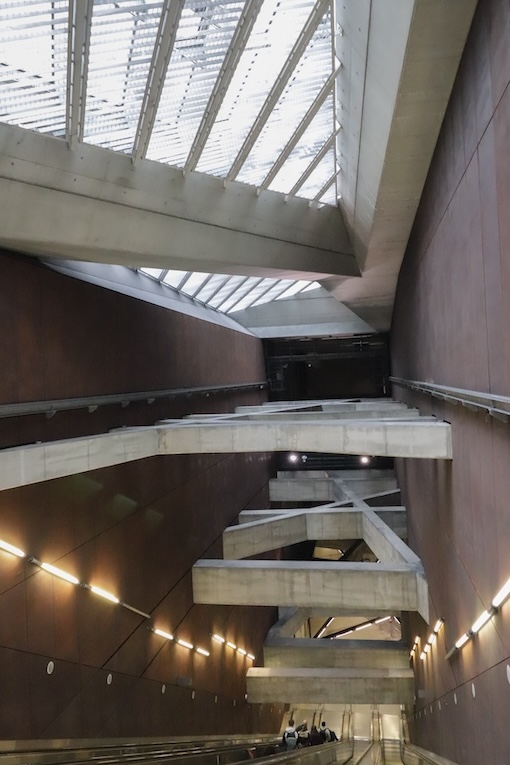 躯体のコンクリートの間をエスカレーターが上がります。