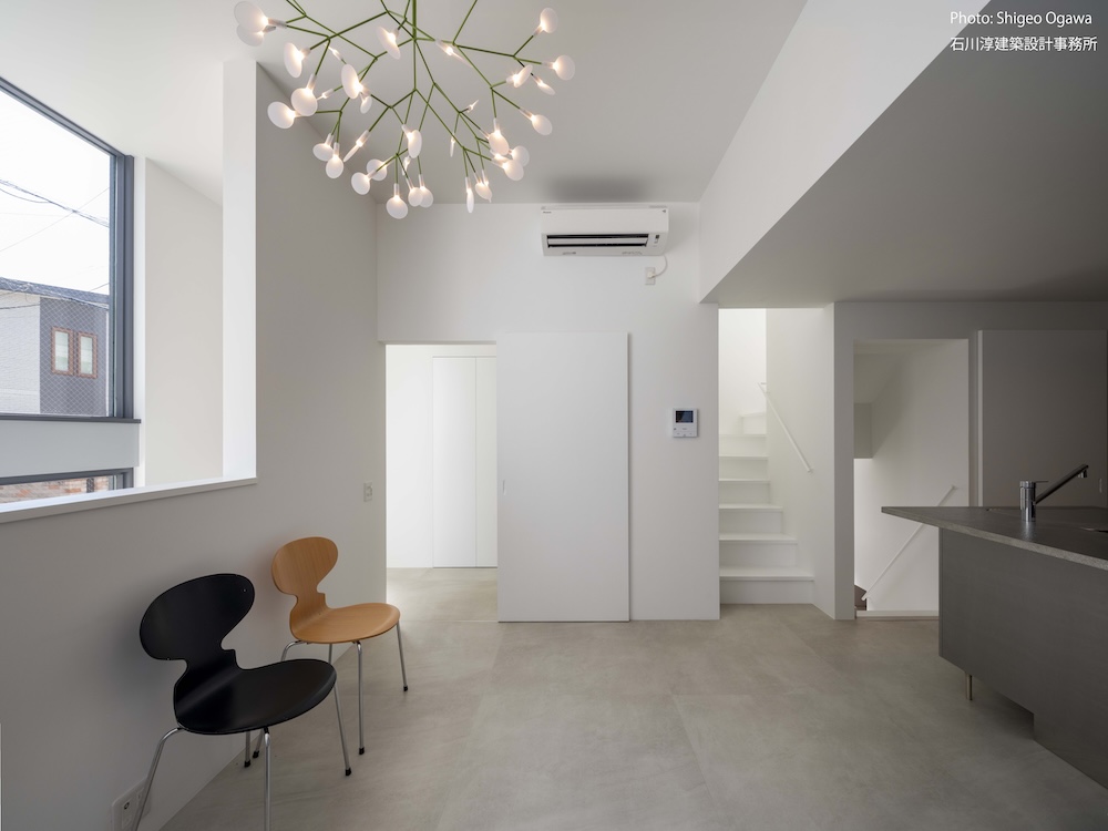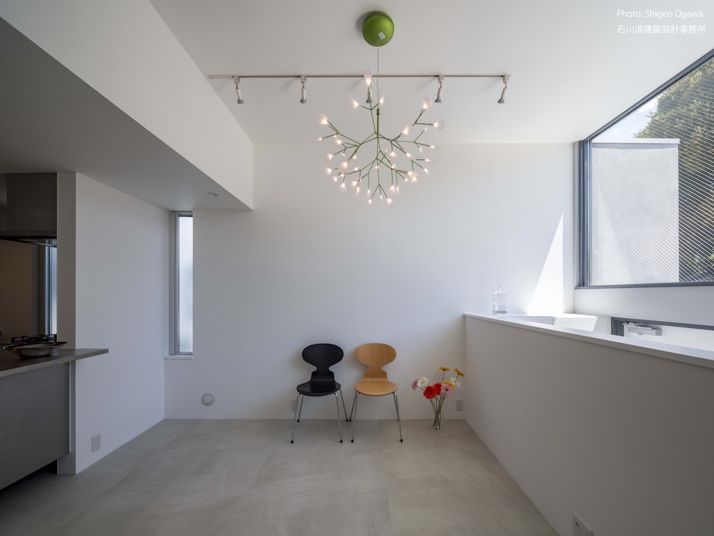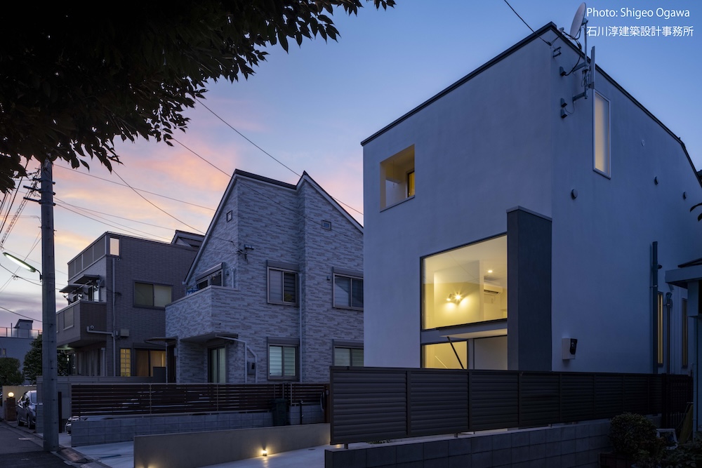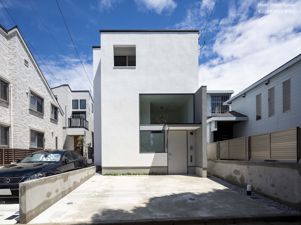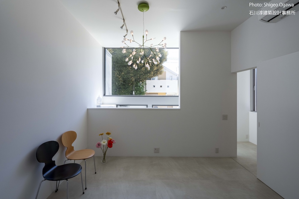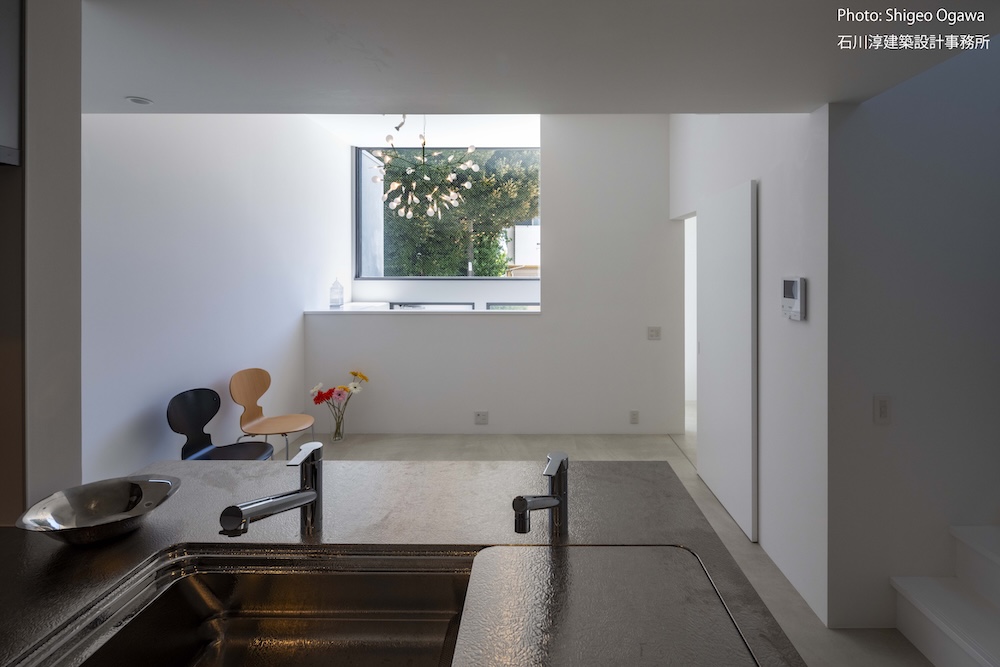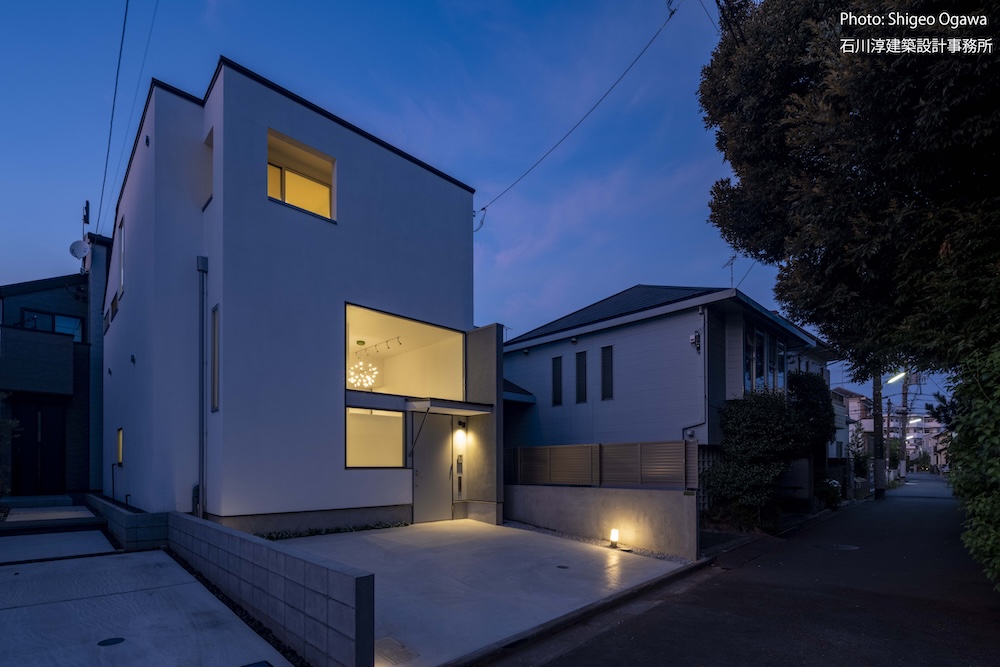 協力不動産コンサルさんと一緒に決めた都内の計画地は4m道路に面した間口5.8m奥行き13.8mの土地で南道路の対岸には大きな樹木があり、静かな時間が流れている場所でした。ご希望は御主人がお持ちの膨大な量の書籍を収納出来る事と、ご夫婦それぞれが仕事のできるスペースと大学生の娘さんの個室を作る事でした。奥様が美術系のお仕事をされている事からシンプルでミニマルな当事務所の作風にご興味いただき、基本的なデザイン方針はお任せいただくような流れで設計が進みました。建物の断面計画は1階の床下に書庫を配置し、その上にリビングと御主人書斎やサニタリーを置き、2階に主寝室と奥様書斎、娘さんの個室があります。外観の特徴は玄関ドアと一体でデザインした大きな窓。内側は玄関ですが書庫のために1階が半層上がっているためリビングからは道路を見下ろす位置関係になり外からはリビングの天井しか見えません。キッチンとリビング照明器具は奥様の選定ですが、その照明器具が大窓越しにワンポイントになりました。