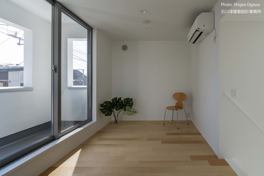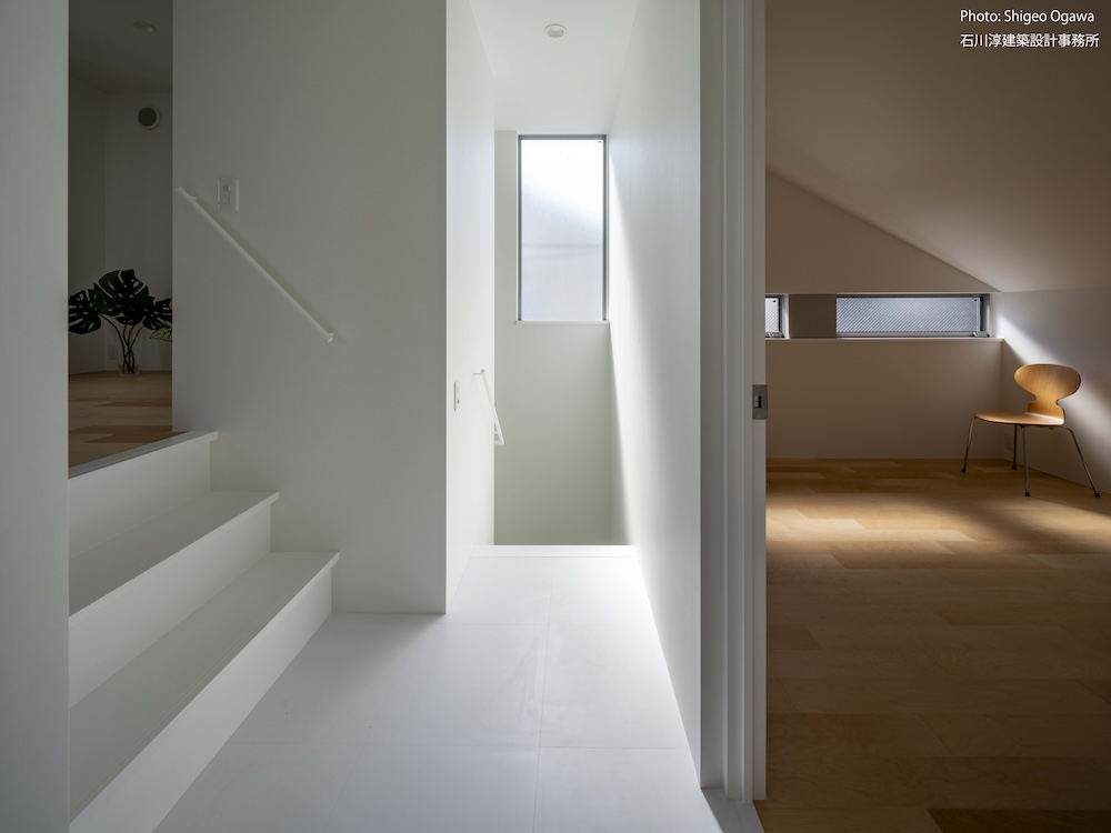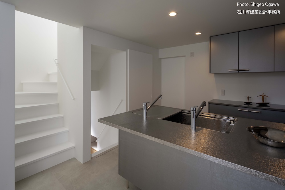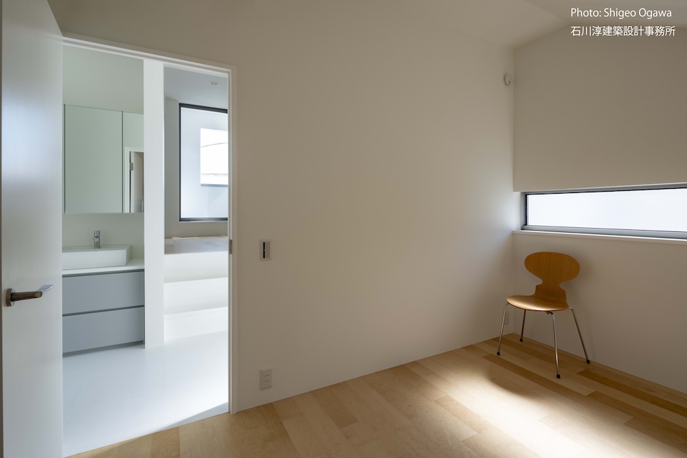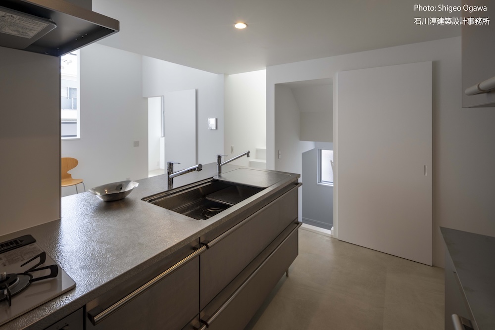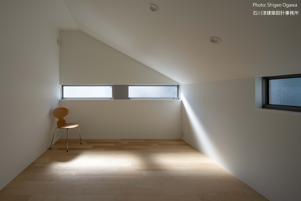 協力不動産コンサルさんと一緒に決めた都内の計画地は4m道路に面した間口5.8m奥行き13.8mの土地で南道路の対岸には大きな樹木があり、静かな時間が流れている場所でした。ご希望は御主人がお持ちの膨大な量の書籍を収納出来る事と、ご夫婦それぞれが仕事のできるスペースと大学生の娘さんの個室を作る事でした。奥様が美術系のお仕事をされている事からシンプルでミニマルな当事務所の作風にご興味いただき、基本的なデザイン方針はお任せいただくような流れで設計が進みました。建物の断面計画は1階の床下に書庫を配置し、その上にリビングと御主人書斎やサニタリーを置き、2階に主寝室と奥様書斎、娘さんの個室があります。外観の特徴は玄関ドアと一体でデザインした大きな窓。内側は玄関ですが書庫のために1階が半層上がっているためリビングからは道路を見下ろす位置関係になり外からはリビングの天井しか見えません。キッチンとリビング照明器具は奥様の選定ですが、その照明器具が大窓越しにワンポイントになりました。