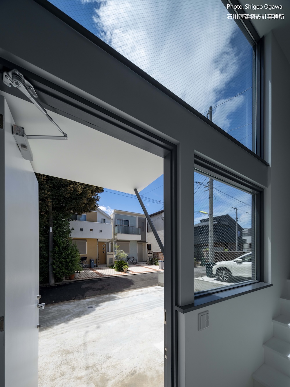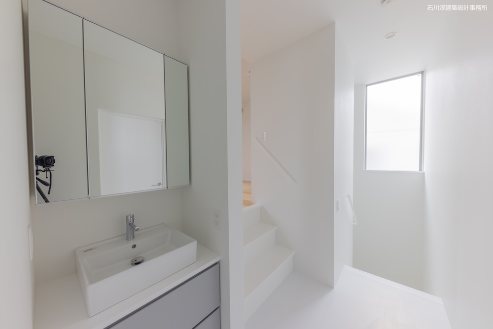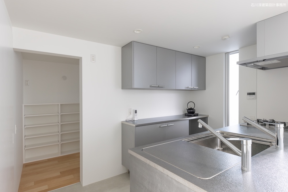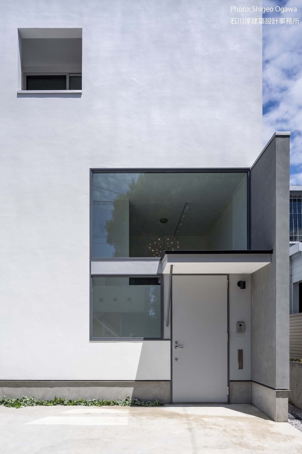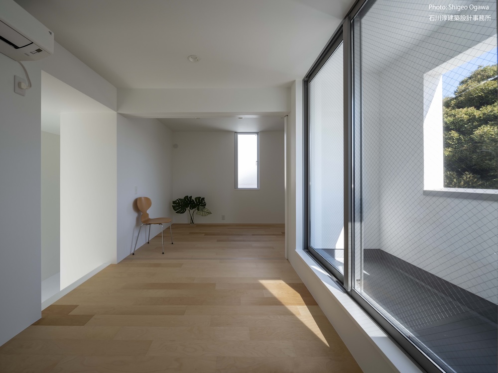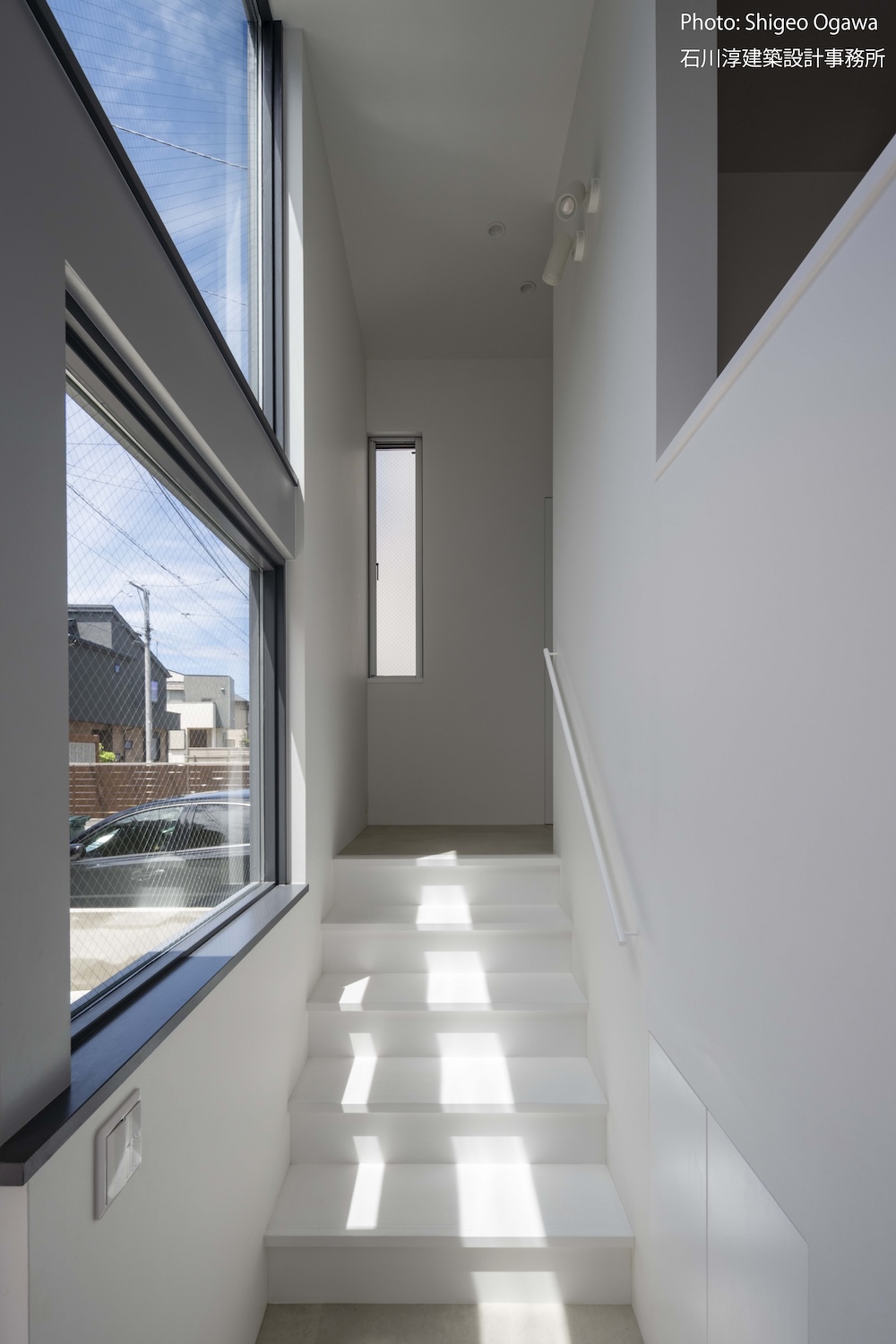 協力不動産コンサルさんと一緒に決めた都内の計画地は4m道路に面した間口5.8m奥行き13.8mの土地で南道路の対岸には大きな樹木があり、静かな時間が流れている場所でした。ご希望は御主人がお持ちの膨大な量の書籍を収納出来る事と、ご夫婦それぞれが仕事のできるスペースと大学生の娘さんの個室を作る事でした。奥様が美術系のお仕事をされている事からシンプルでミニマルな当事務所の作風にご興味いただき、基本的なデザイン方針はお任せいただくような流れで設計が進みました。建物の断面計画は1階の床下に書庫を配置し、その上にリビングと御主人書斎やサニタリーを置き、2階に主寝室と奥様書斎、娘さんの個室があります。外観の特徴は玄関ドアと一体でデザインした大きな窓。内側は玄関ですが書庫のために1階が半層上がっているためリビングからは道路を見下ろす位置関係になり外からはリビングの天井しか見えません。キッチンとリビング照明器具は奥様の選定ですが、その照明器具が大窓越しにワンポイントになりました。