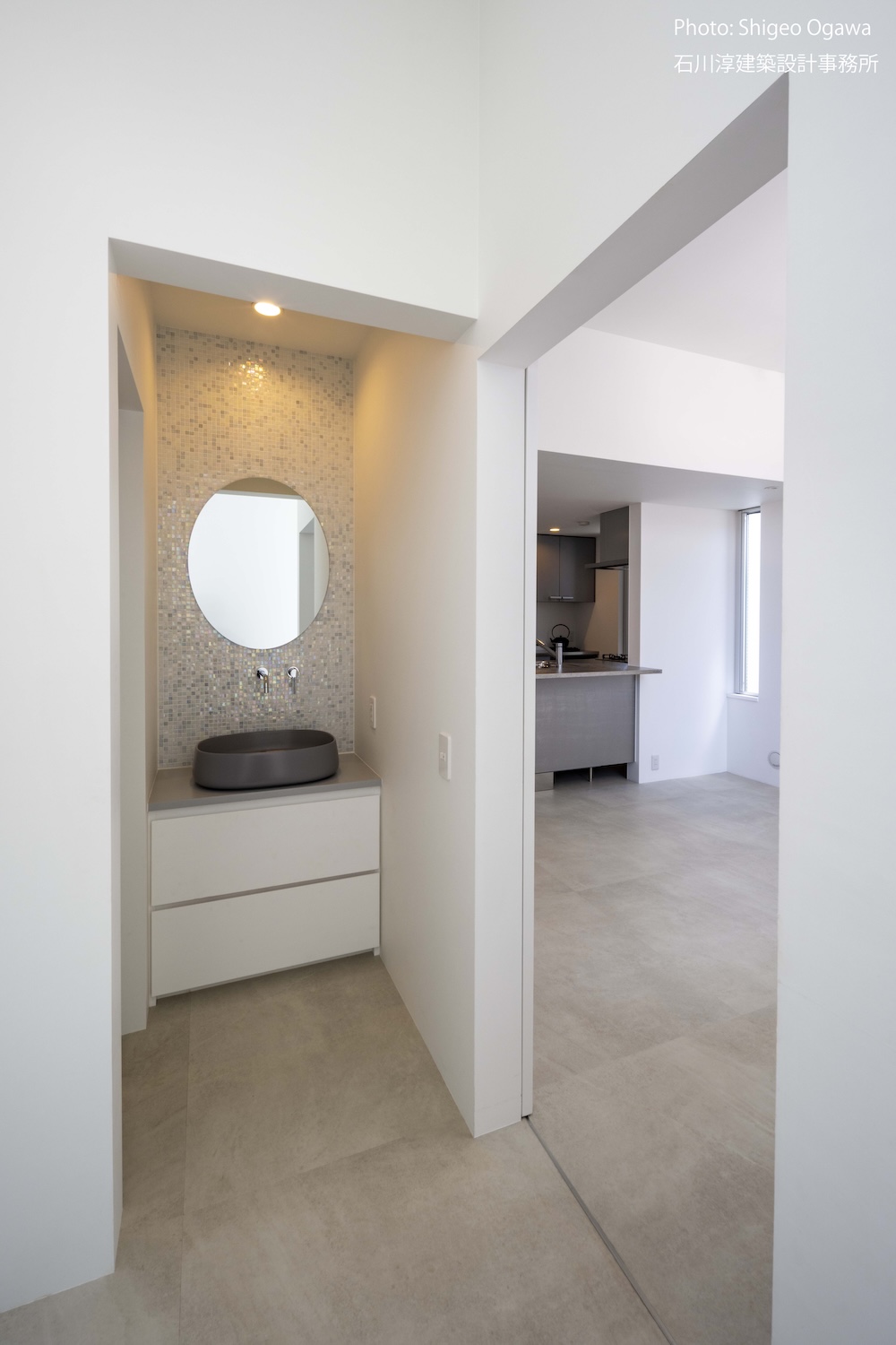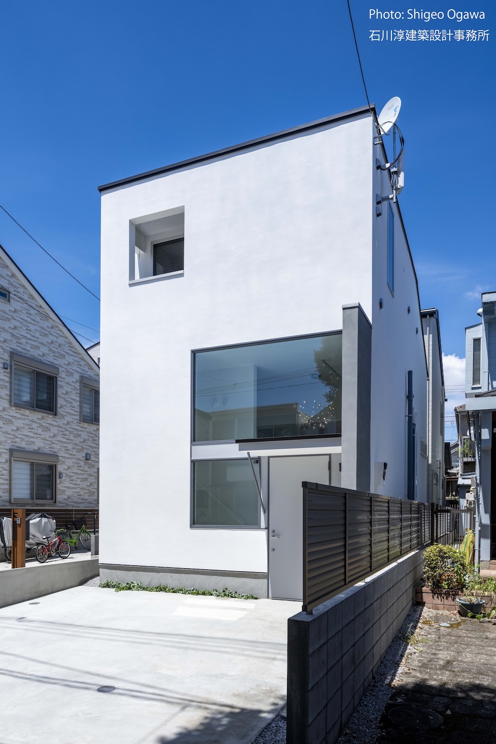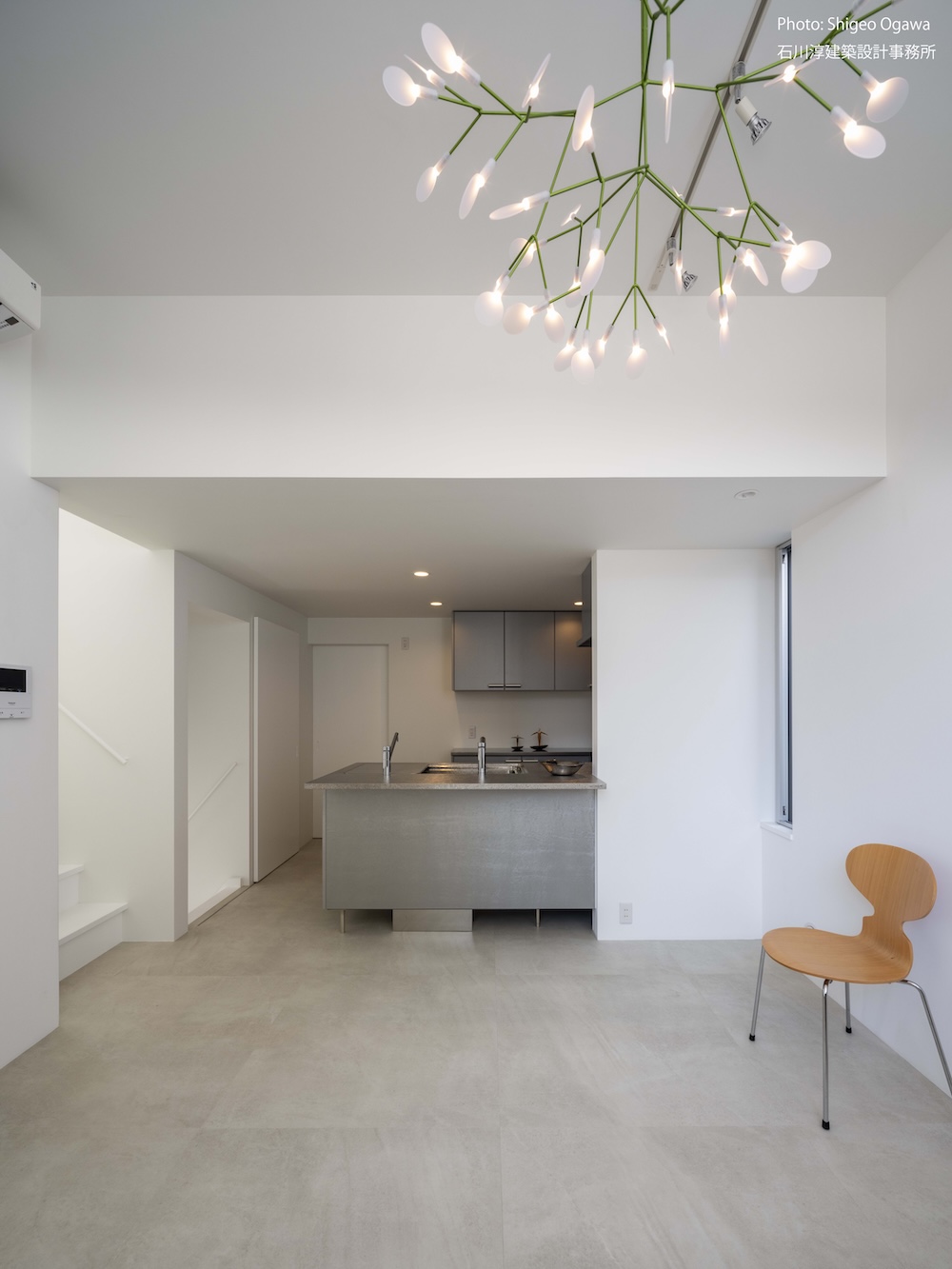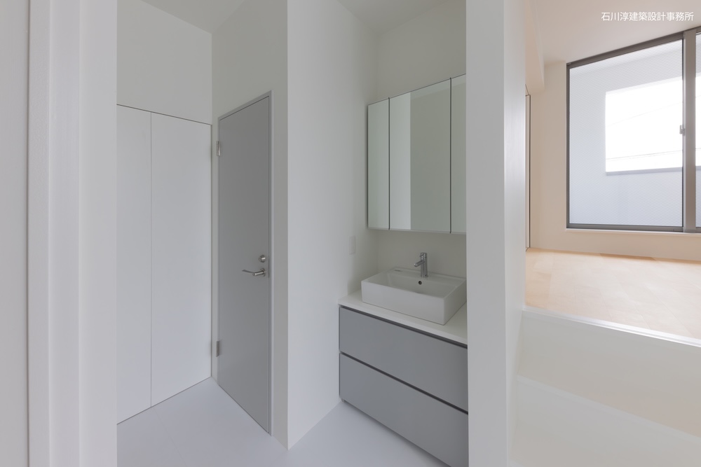 協力不動産コンサルさんと一緒に決めた都内の計画地は4m道路に面した間口5.8m奥行き13.8mの土地で南道路の対岸には大きな樹木があり、静かな時間が流れている場所でした。ご希望は御主人がお持ちの膨大な量の書籍を収納出来る事と、ご夫婦それぞれが仕事のできるスペースと大学生の娘さんの個室を作る事でした。奥様が美術系のお仕事をされている事からシンプルでミニマルな当事務所の作風にご興味いただき、基本的なデザイン方針はお任せいただくような流れで設計が進みました。建物の断面計画は1階の床下に書庫を配置し、その上にリビングと御主人書斎やサニタリーを置き、2階に主寝室と奥様書斎、娘さんの個室があります。外観の特徴は玄関ドアと一体でデザインした大きな窓。内側は玄関ですが書庫のために1階が半層上がっているためリビングからは道路を見下ろす位置関係になり外からはリビングの天井しか見えません。キッチンとリビング照明器具は奥様の選定ですが、その照明器具が大窓越しにワンポイントになりました。