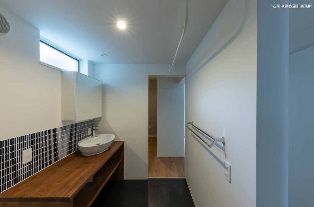 さて、道路対岸には五重塔のある小さな寺院があります。これを借景しない手はありません。大きな正方形の窓とその横に長方形の窓を連続させてコーナーサッシュとし、眺望を取り込みます。さらに、2段あがったスキップフロアにより、キッチンからも大窓を見渡しやすくなっています。当初のプレゼン案では屋上は無くて天窓がありましたが御主人のたってのご希望で屋上バルコニーに。バルコニーとリビングの間はハイサイドライト窓として、プライベートな空を見渡す事ができます。