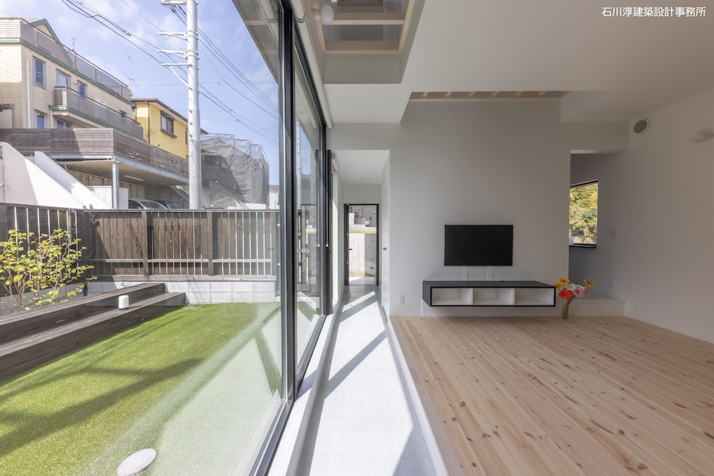 計画地からは北側の眺望も取れるので2階リビングにして北に開く案も考えられますが、ご希望の大きさの家であれば庭を広く取れることから1階リビングにして、リビングにつながる庭を提案する事にしました。さらにリビングには玄関から続くモルタル土間のエリアを引き込み、縁側のような場所を室内に作り、その先に庭が見渡せるという構成にしました。